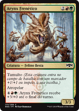 | Rules | Riot (This creature enters the battlefield with your choice of a +1/+1 counter or haste.) Trample : Frenzied Arynx gets +3/+0 until end of turn. |