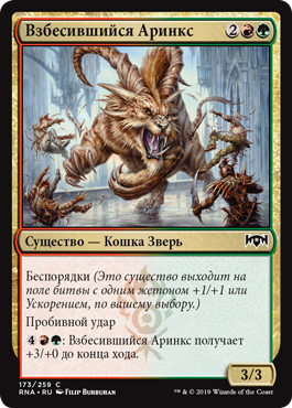 | Rules | Riot (This creature enters the battlefield with your choice of a +1/+1 counter or haste.) Trample : Frenzied Arynx gets +3/+0 until end of turn. |