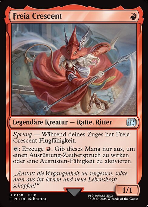 | Rules | Jump — During your turn, Freya Crescent has flying. : Add . Spend this mana only to cast an Equipment spell or activate an equip ability. |