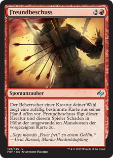 | Rules | Target creature's controller reveals a card at random from their hand. Friendly Fire deals damage to that creature and that player equal to the revealed card's mana value. |