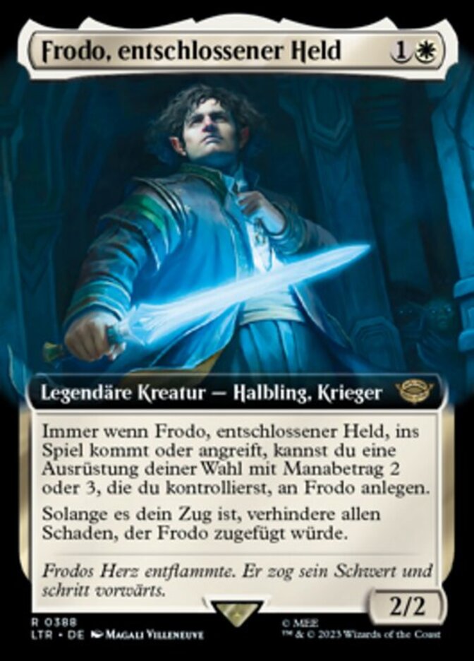 | Rules | Whenever Frodo, Determined Hero enters the battlefield or attacks, you may attach target Equipment you control with mana value 2 or 3 to Frodo. As long as it's your turn, prevent all damage that would be dealt to Frodo. |