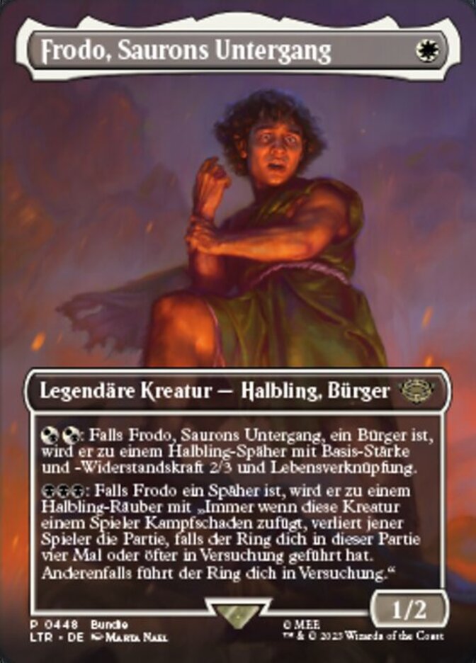 | Rules | : If Frodo, Sauron's Bane is a Citizen, it becomes a Halfling Scout with base power and toughness 2/3 and lifelink. : If Frodo is a Scout, it becomes a Halfling Rogue with "Whenever this creature deals combat damage to a player, that player loses the game if the Ring has tempted you four or more times this game. Otherwise, the Ring tempts you." |