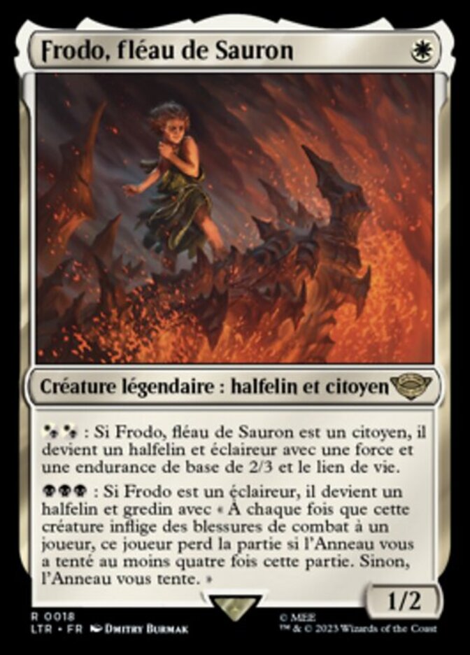 | Rules | : If Frodo, Sauron's Bane is a Citizen, it becomes a Halfling Scout with base power and toughness 2/3 and lifelink. : If Frodo is a Scout, it becomes a Halfling Rogue with "Whenever this creature deals combat damage to a player, that player loses the game if the Ring has tempted you four or more times this game. Otherwise, the Ring tempts you." |