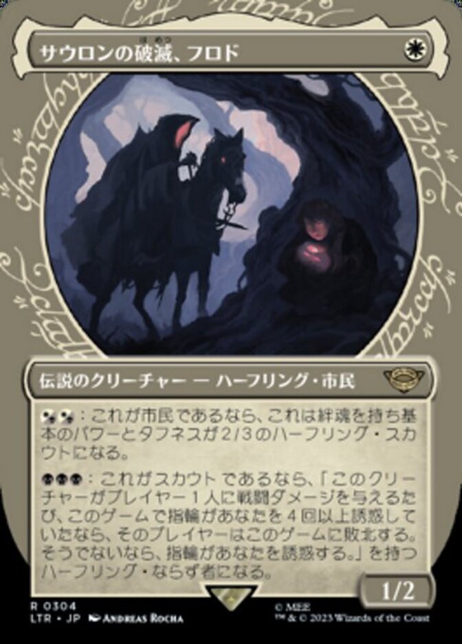 | Rules | : If Frodo, Sauron's Bane is a Citizen, it becomes a Halfling Scout with base power and toughness 2/3 and lifelink. : If Frodo is a Scout, it becomes a Halfling Rogue with "Whenever this creature deals combat damage to a player, that player loses the game if the Ring has tempted you four or more times this game. Otherwise, the Ring tempts you." |