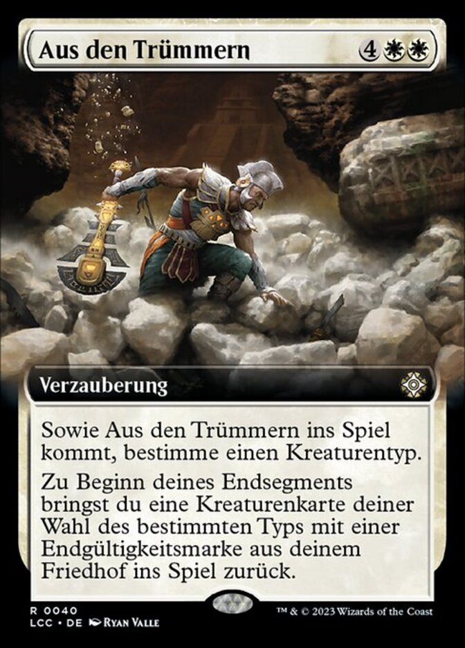 | Rules | As From the Rubble enters the battlefield, choose a creature type. At the beginning of your end step, return target creature card of the chosen type from your graveyard to the battlefield with a finality counter on it. (If a creature with a finality counter on it would die, exile it instead.) |