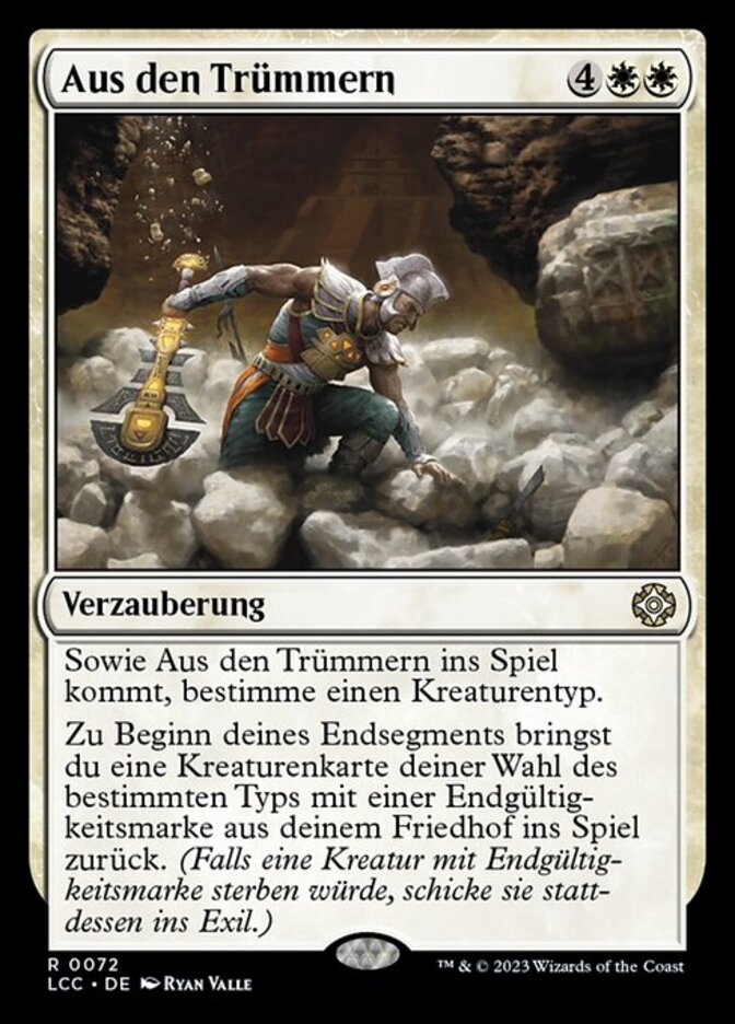 | Rules | As From the Rubble enters the battlefield, choose a creature type. At the beginning of your end step, return target creature card of the chosen type from your graveyard to the battlefield with a finality counter on it. (If a creature with a finality counter on it would die, exile it instead.) |