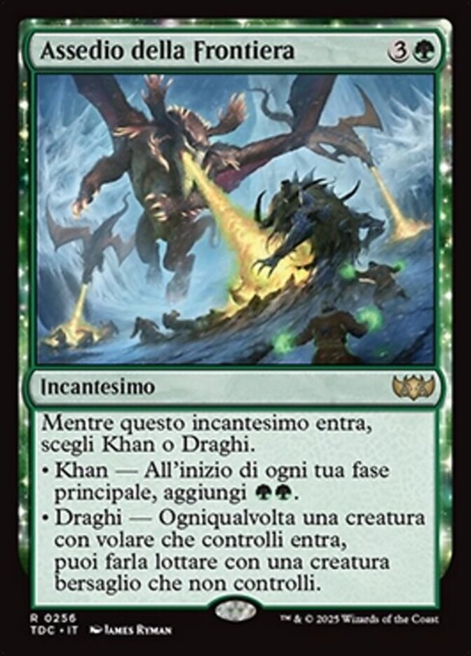 | Rules | As Frontier Siege enters the battlefield, choose Khans or Dragons. • Khans — At the beginning of each of your main phases, add . • Dragons — Whenever a creature with flying enters the battlefield under your control, you may have it fight target creature you don't control. |