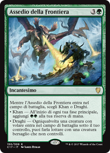 | Rules | As Frontier Siege enters the battlefield, choose Khans or Dragons. • Khans — At the beginning of each of your main phases, add . • Dragons — Whenever a creature with flying enters the battlefield under your control, you may have it fight target creature you don't control. |