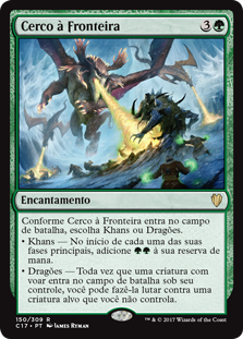 | Rules | As Frontier Siege enters the battlefield, choose Khans or Dragons. • Khans — At the beginning of each of your main phases, add . • Dragons — Whenever a creature with flying enters the battlefield under your control, you may have it fight target creature you don't control. |