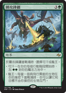 | Rules | As Frontier Siege enters the battlefield, choose Khans or Dragons. • Khans — At the beginning of each of your main phases, add . • Dragons — Whenever a creature with flying enters the battlefield under your control, you may have it fight target creature you don't control. |
