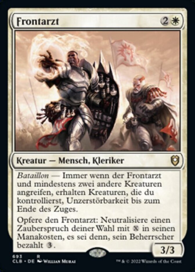 | Rules | Battalion — Whenever Frontline Medic and at least two other creatures attack, creatures you control gain indestructible until end of turn. Sacrifice Frontline Medic: Counter target spell with in its mana cost unless its controller pays . |