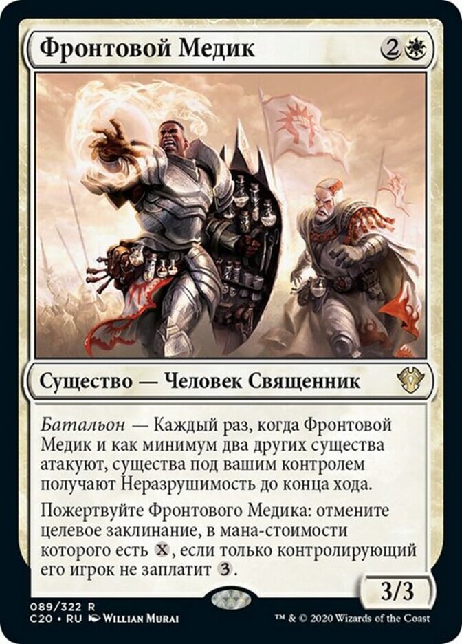 | Rules | Battalion — Whenever Frontline Medic and at least two other creatures attack, creatures you control gain indestructible until end of turn. Sacrifice Frontline Medic: Counter target spell with in its mana cost unless its controller pays . |