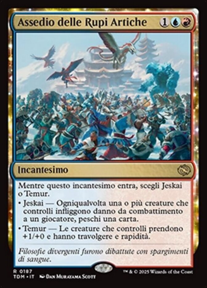| Rules | As this enchantment enters, choose Jeskai or Temur. • Jeskai — Whenever one or more creatures you control deal combat damage to a player, draw a card. • Temur — Creatures you control get +1/+0 and have trample and haste. |