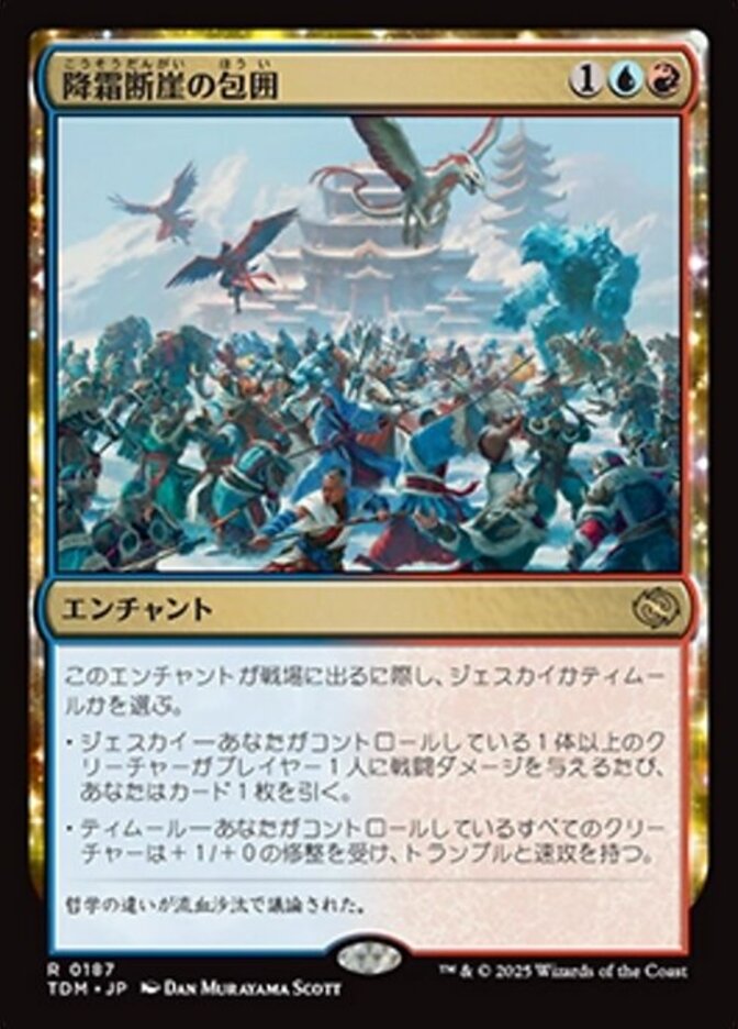 | Rules | As this enchantment enters, choose Jeskai or Temur. • Jeskai — Whenever one or more creatures you control deal combat damage to a player, draw a card. • Temur — Creatures you control get +1/+0 and have trample and haste. |