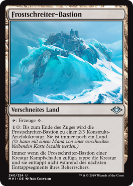 | Rules | : Add . : Until end of turn, Frostwalk Bastion becomes a 2/3 Construct artifact creature. It's still a land. ( can be paid with one mana from a snow source.) Whenever Frostwalk Bastion deals combat damage to a creature, tap that creature and it doesn't untap during its controller's next untap step. |