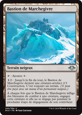| Rules | : Add . : Until end of turn, Frostwalk Bastion becomes a 2/3 Construct artifact creature. It's still a land. ( can be paid with one mana from a snow source.) Whenever Frostwalk Bastion deals combat damage to a creature, tap that creature and it doesn't untap during its controller's next untap step. |
