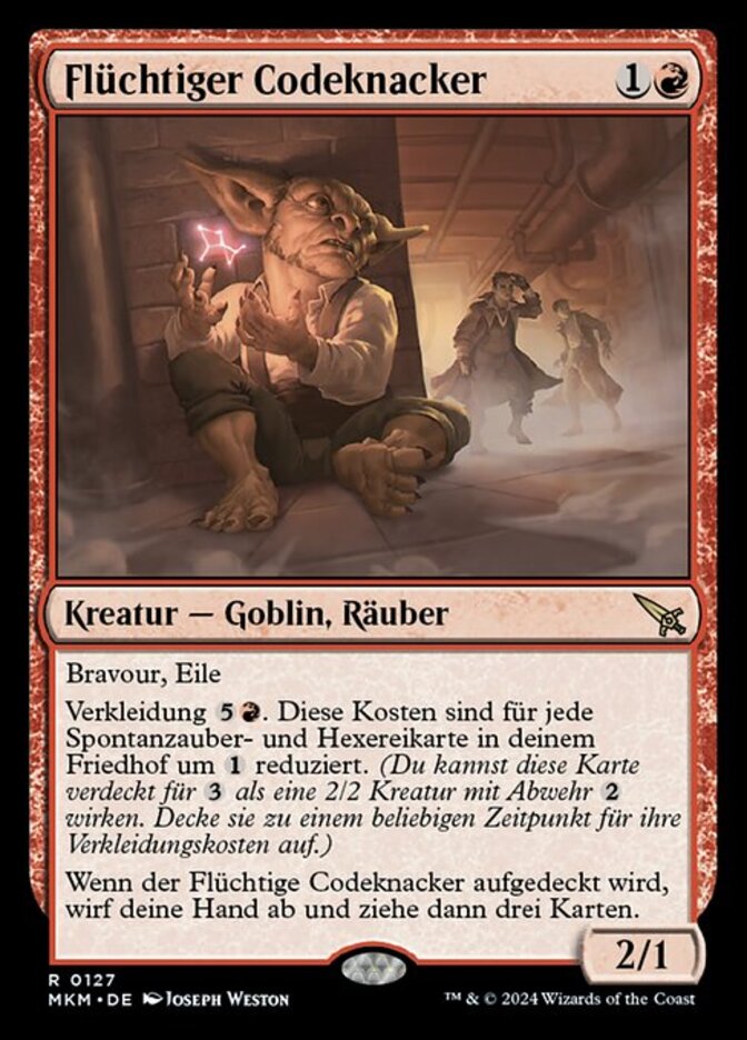 | Rules | Prowess, haste Disguise . This cost is reduced by for each instant and sorcery card in your graveyard. (You may cast this card face down for as a 2/2 creature with ward . Turn it face up any time for its disguise cost.) When Fugitive Codebreaker is turned face up, discard your hand, then draw three cards. |