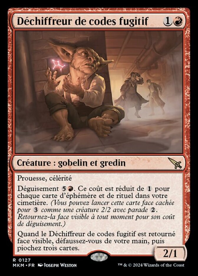 | Rules | Prowess, haste Disguise . This cost is reduced by for each instant and sorcery card in your graveyard. (You may cast this card face down for as a 2/2 creature with ward . Turn it face up any time for its disguise cost.) When Fugitive Codebreaker is turned face up, discard your hand, then draw three cards. |