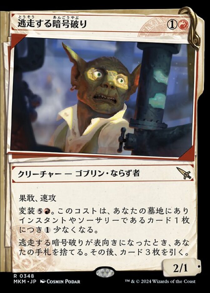 | Rules | Prowess, haste Disguise . This cost is reduced by for each instant and sorcery card in your graveyard. (You may cast this card face down for as a 2/2 creature with ward . Turn it face up any time for its disguise cost.) When Fugitive Codebreaker is turned face up, discard your hand, then draw three cards. |