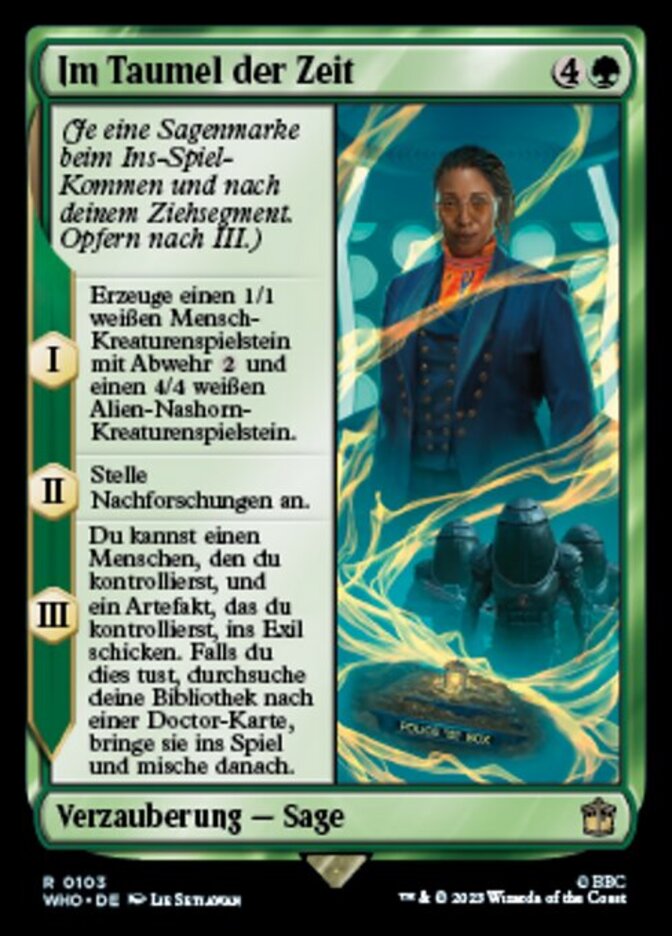 | Rules | (As this Saga enters and after your draw step, add a lore counter. Sacrifice after III.) I — Create a 1/1 white Human creature token with ward and a 4/4 white Alien Rhino creature token. II — Investigate. III — You may exile a Human you control and an artifact you control. If you do, search your library for a Doctor card, put it onto the battlefield, then shuffle. |
