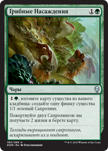| Rules | , Exile a creature card from your graveyard: Create a 1/1 green Saproling creature token. Sacrifice two Saprolings: You gain 2 life and draw a card. |