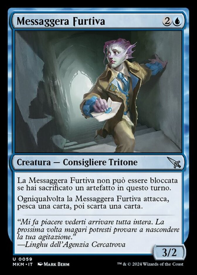 | Rules | Furtive Courier can't be blocked as long as you've sacrificed an artifact this turn. Whenever Furtive Courier attacks, draw a card, then discard a card. |