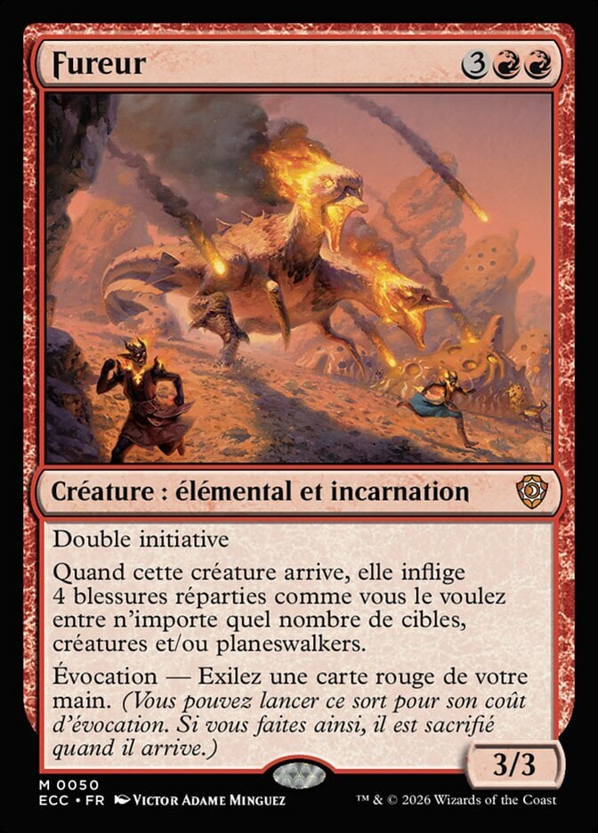 | Rules | Double strike When Fury enters the battlefield, it deals 4 damage divided as you choose among any number of target creatures and/or planeswalkers. Evoke—Exile a red card from your hand. |