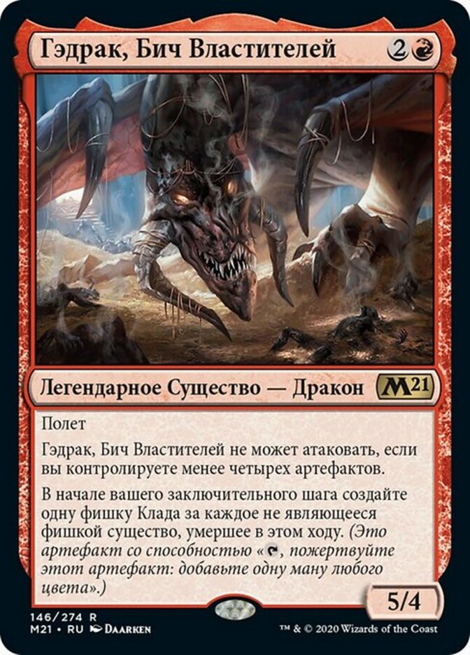 | Rules | Flying Gadrak, the Crown-Scourge can't attack unless you control four or more artifacts. At the beginning of your end step, create a Treasure token for each nontoken creature that died this turn. (It's an artifact with ", Sacrifice this artifact: Add one mana of any color.") |