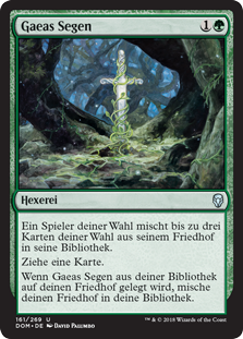| Rules | Target player shuffles up to three target cards from their graveyard into their library. Draw a card. When Gaea's Blessing is put into your graveyard from your library, shuffle your graveyard into your library. |