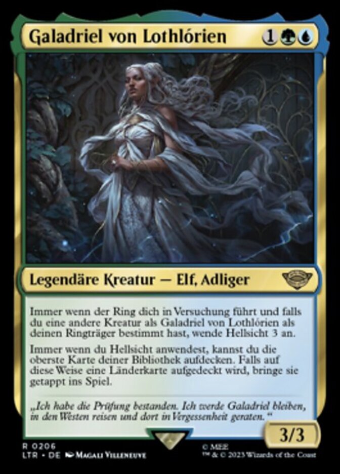 | Rules | Whenever the Ring tempts you, if you chose a creature other than Galadriel of Lothlórien as your Ring-bearer, scry 3. Whenever you scry, you may reveal the top card of your library. If a land card is revealed this way, put it onto the battlefield tapped. |