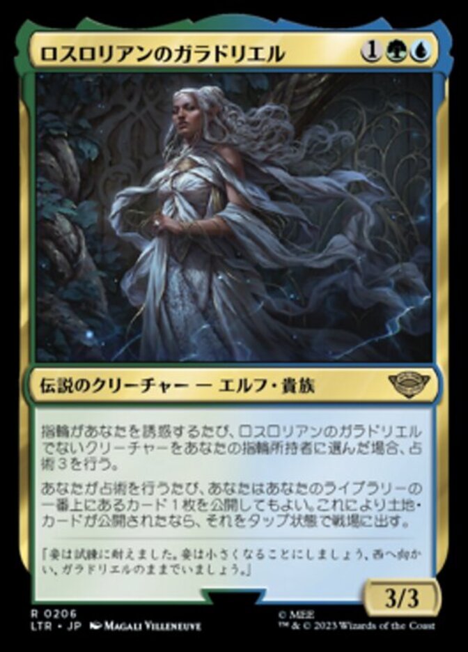 | Rules | Whenever the Ring tempts you, if you chose a creature other than Galadriel of Lothlórien as your Ring-bearer, scry 3. Whenever you scry, you may reveal the top card of your library. If a land card is revealed this way, put it onto the battlefield tapped. |