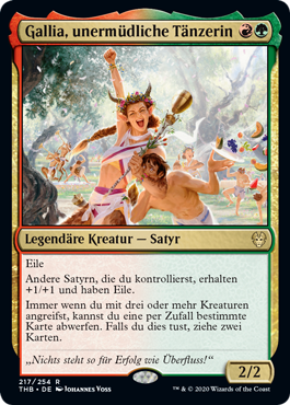 | Rules | Haste Other Satyrs you control get +1/+1 and have haste. Whenever you attack with three or more creatures, you may discard a card at random. If you do, draw two cards. |
