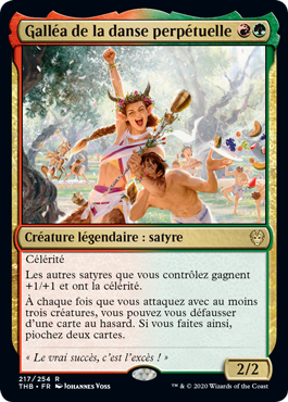| Rules | Haste Other Satyrs you control get +1/+1 and have haste. Whenever you attack with three or more creatures, you may discard a card at random. If you do, draw two cards. |