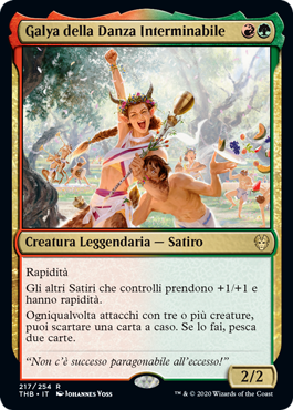 | Rules | Haste Other Satyrs you control get +1/+1 and have haste. Whenever you attack with three or more creatures, you may discard a card at random. If you do, draw two cards. |