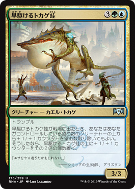 | Rules | Trample When Galloping Lizrog enters the battlefield, you may remove any number of +1/+1 counters from among creatures you control. If you do, put twice that many +1/+1 counters on Galloping Lizrog. |