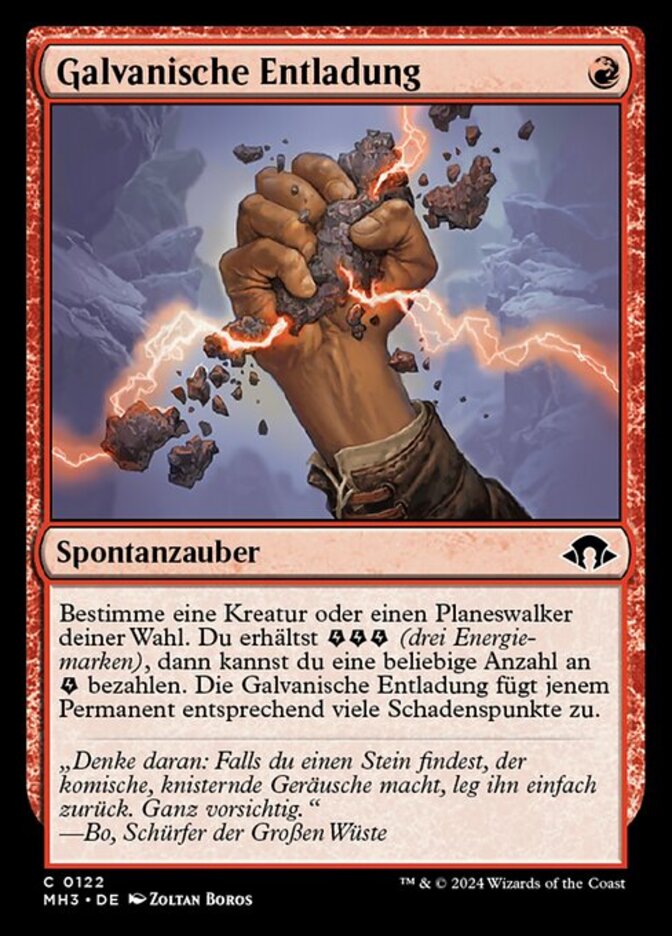 | Rules | Choose target creature or planeswalker. You get (three energy counters), then you may pay any amount of . Galvanic Discharge deals that much damage to that permanent. |