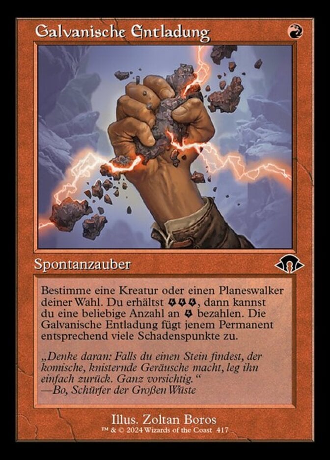 | Rules | Choose target creature or planeswalker. You get (three energy counters), then you may pay any amount of . Galvanic Discharge deals that much damage to that permanent. |