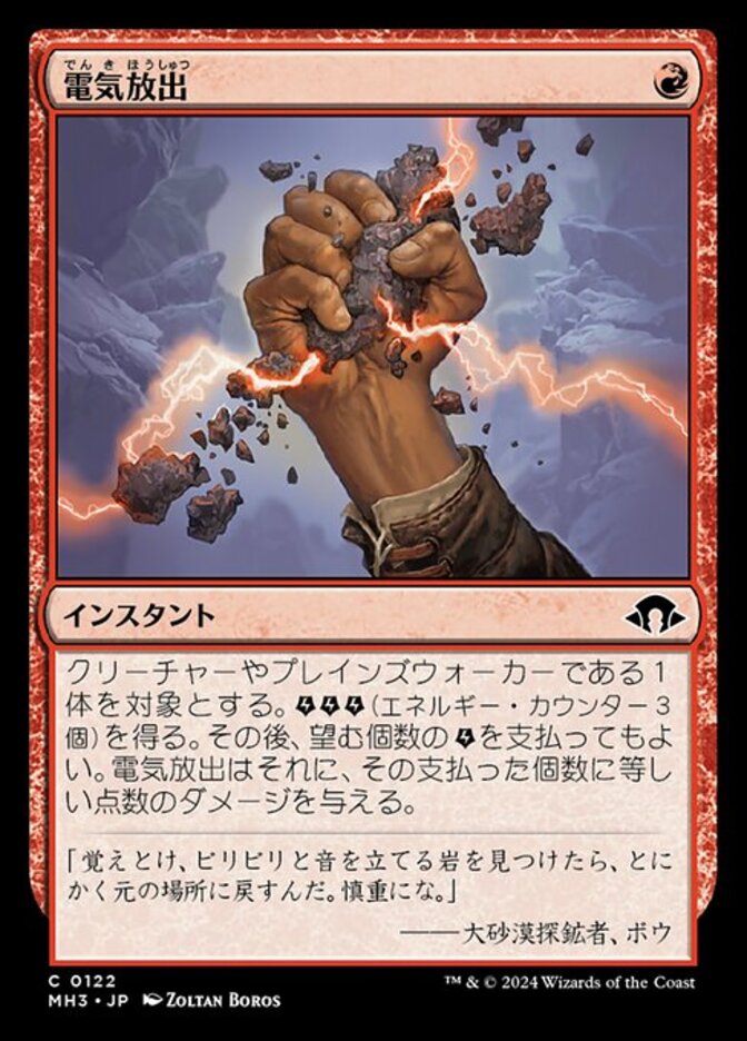 | Rules | Choose target creature or planeswalker. You get (three energy counters), then you may pay any amount of . Galvanic Discharge deals that much damage to that permanent. |