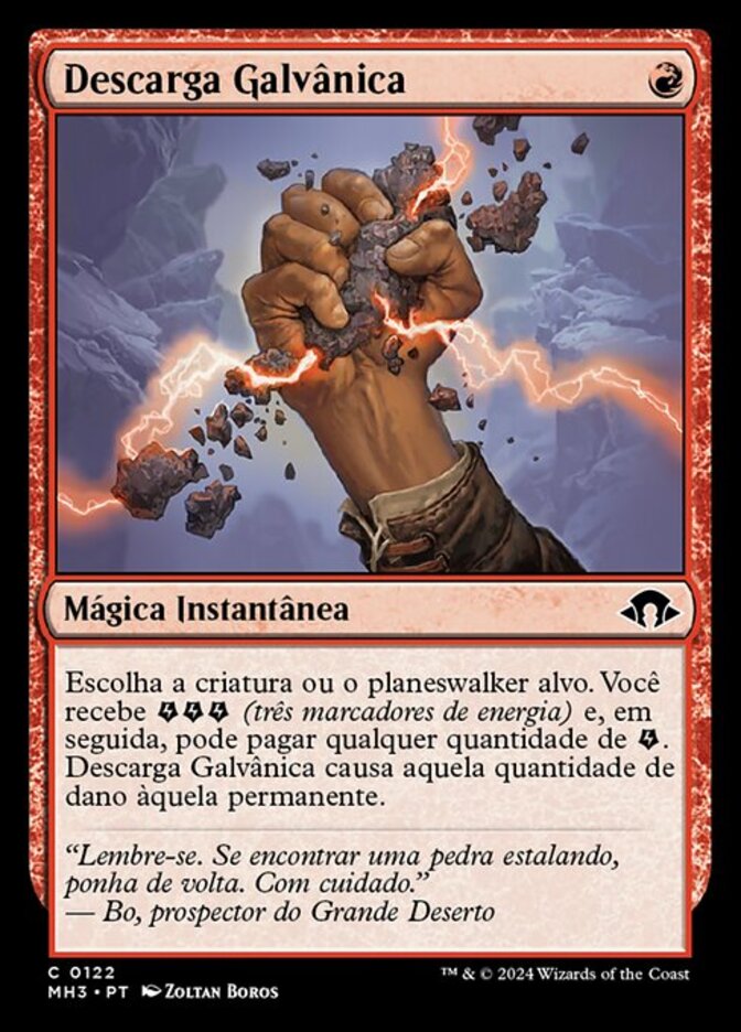 | Rules | Choose target creature or planeswalker. You get (three energy counters), then you may pay any amount of . Galvanic Discharge deals that much damage to that permanent. |