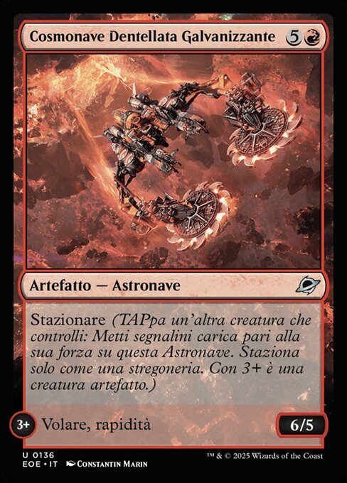 | Rules | Station (Tap another creature you control: Put charge counters equal to its power on this Spacecraft. Station only as a sorcery. It's an artifact creature at 3+.) STATION 3+ Flying, haste |