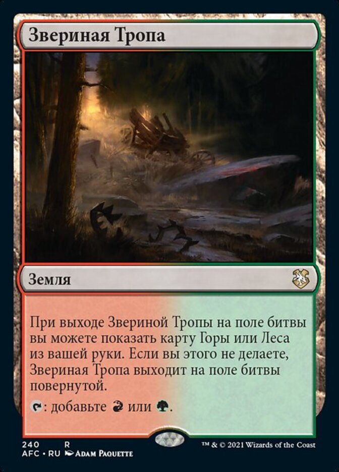 | Rules | As Game Trail enters the battlefield, you may reveal a Mountain or Forest card from your hand. If you don't, Game Trail enters the battlefield tapped. : Add or . |