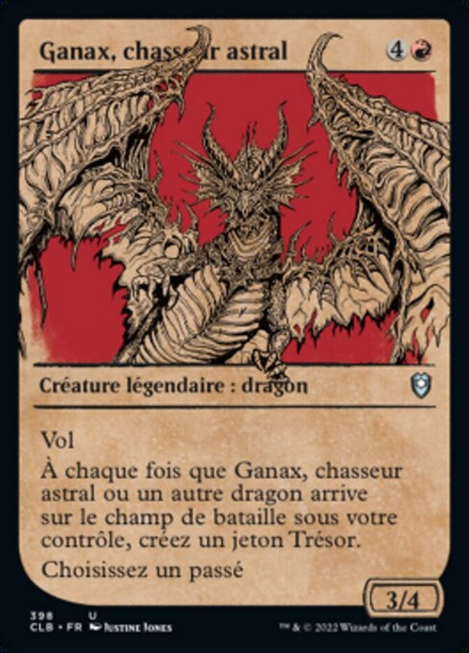 | Rules | Flying Whenever Ganax, Astral Hunter or another Dragon you control enters the battlefield under your control, create a Treasure token. (It's an artifact with ", Sacrifice this artifact: Add one mana of any color.") Choose a Background (You can have a Background as a second commander.) |