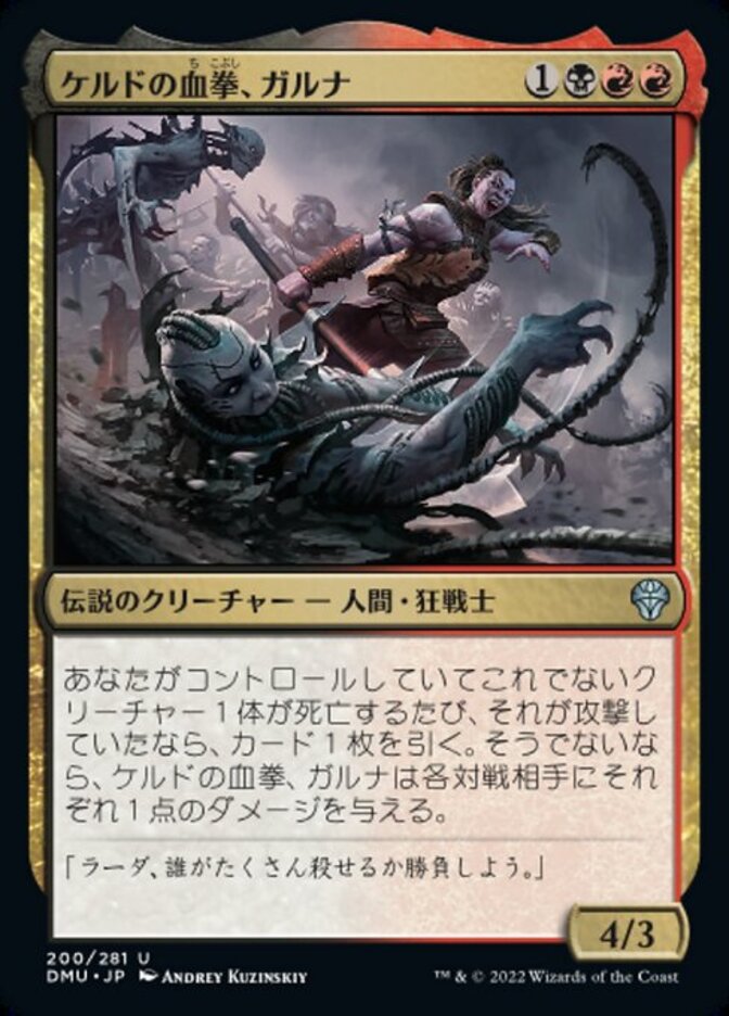 | Rules | Whenever another creature you control dies, draw a card if it was attacking. Otherwise, Garna, Bloodfist of Keld deals 1 damage to each opponent. |