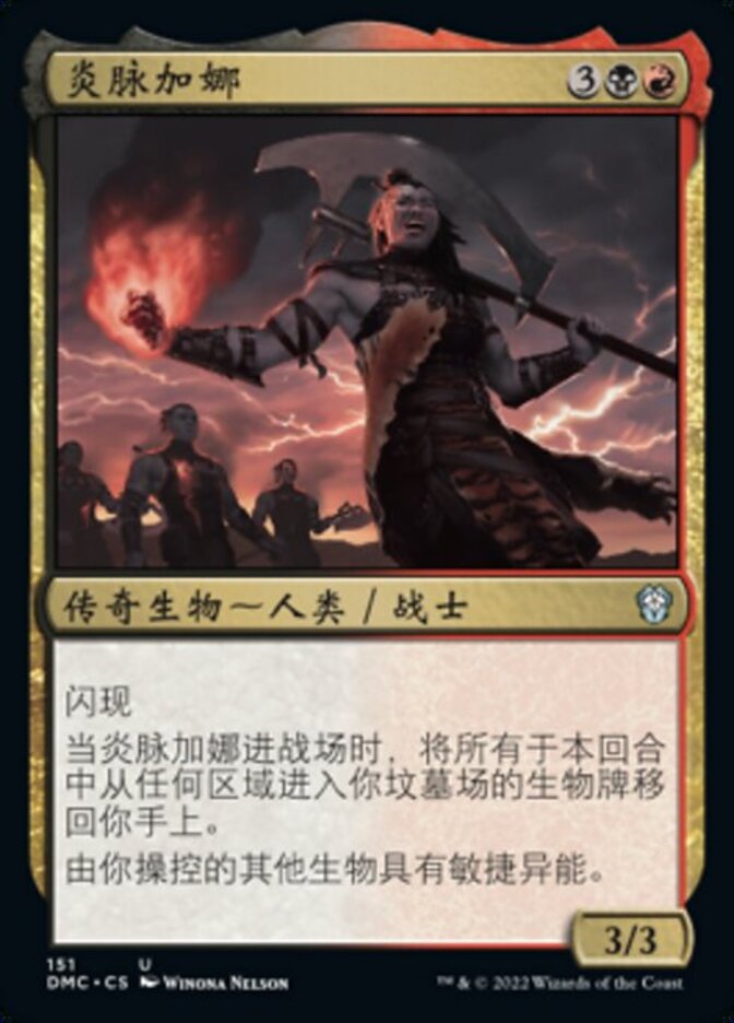 | Rules | Flash When Garna, the Bloodflame enters the battlefield, return to your hand all creature cards in your graveyard that were put there from anywhere this turn. Other creatures you control have haste. |