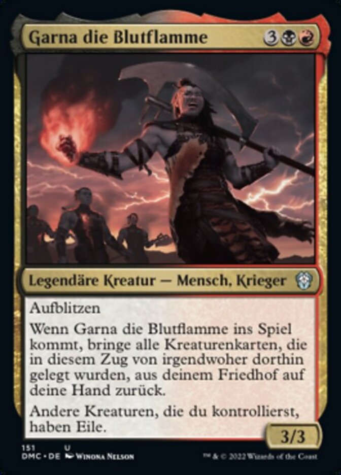| Rules | Flash When Garna, the Bloodflame enters the battlefield, return to your hand all creature cards in your graveyard that were put there from anywhere this turn. Other creatures you control have haste. |
