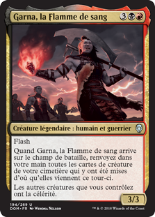| Rules | Flash When Garna, the Bloodflame enters the battlefield, return to your hand all creature cards in your graveyard that were put there from anywhere this turn. Other creatures you control have haste. |
