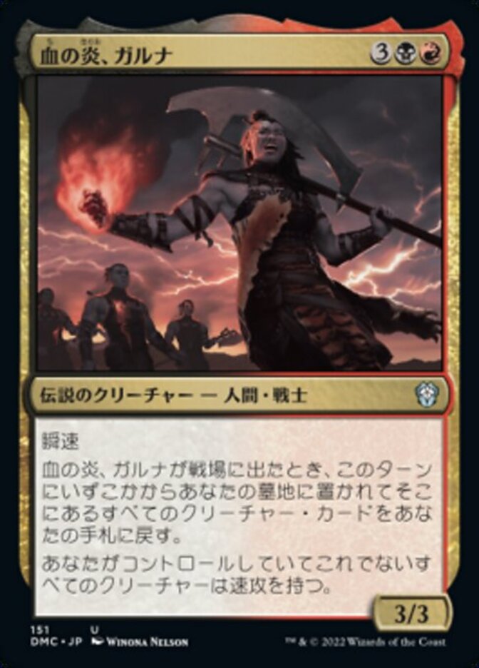 | Rules | Flash When Garna, the Bloodflame enters the battlefield, return to your hand all creature cards in your graveyard that were put there from anywhere this turn. Other creatures you control have haste. |