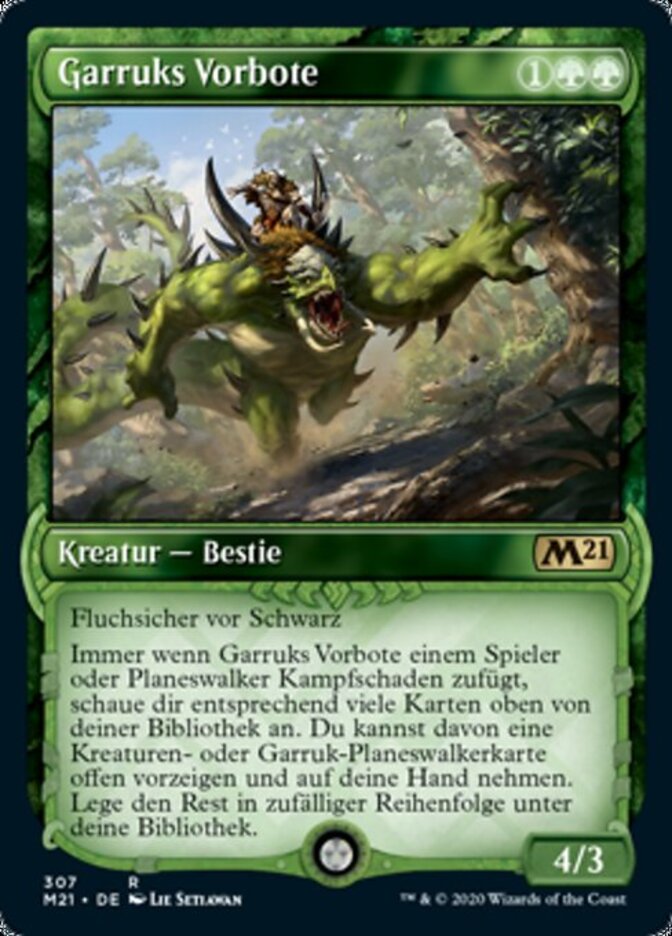 | Rules | Hexproof from black Whenever Garruk's Harbinger deals combat damage to a player or planeswalker, look at that many cards from the top of your library. You may reveal a creature card or Garruk planeswalker card from among them and put it into your hand. Put the rest on the bottom of your library in a random order. |