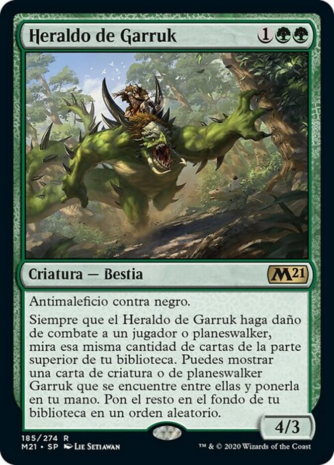 | Rules | Hexproof from black Whenever Garruk's Harbinger deals combat damage to a player or planeswalker, look at that many cards from the top of your library. You may reveal a creature card or Garruk planeswalker card from among them and put it into your hand. Put the rest on the bottom of your library in a random order. |