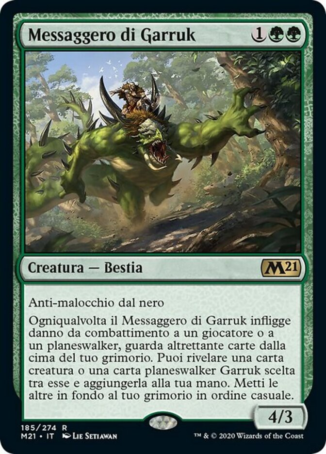 | Rules | Hexproof from black Whenever Garruk's Harbinger deals combat damage to a player or planeswalker, look at that many cards from the top of your library. You may reveal a creature card or Garruk planeswalker card from among them and put it into your hand. Put the rest on the bottom of your library in a random order. |